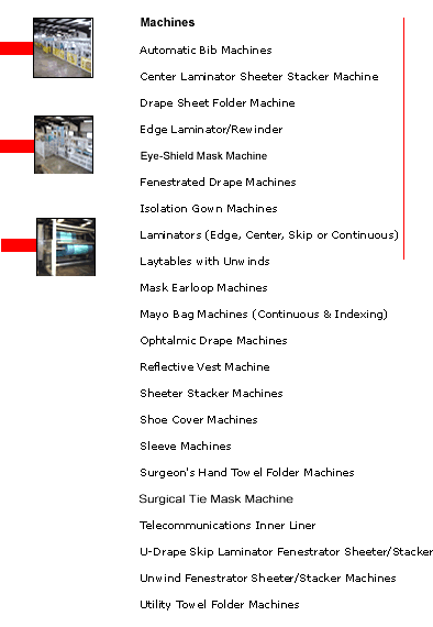 Click Here to EMail Max Tec Home About Us Designs and Customers Contact Us Click Here for a larger picture of this machine.  Edge Laminator Machine:  This machine continuously unwinds, edge laminates, then rewinds various drape materials. Click here for a larger picture of this machine.  This is a continuous machine that produces a poly bag with an attached printed nonwoven patch. Click here for a larger picture of this machine.  This machine automatically produces finished surgical drapes.  it unwinds multiple materials, skip laminates reinforcements patches, side laminates, fenestrates, prints and labels, then stacks and discharg